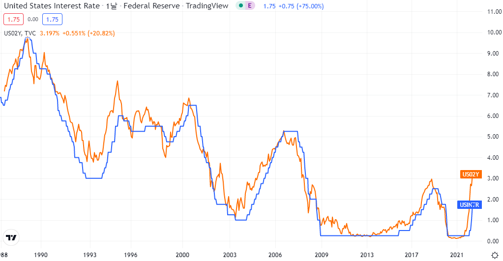 또한, 금리상승기에 기준금리와 2년물 금리 차트가 만나게 되면 더이상 추가적인 금리 상승 없이