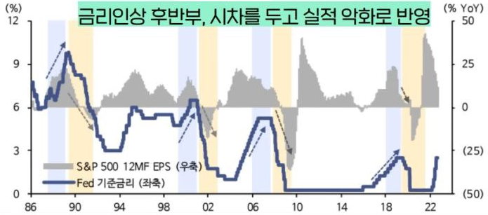 아래 첫번째 그래프를 보시면 금리인상은 기업의 실적 악화를 불러오게 되지만 시차를 두고 반영되기 때문에