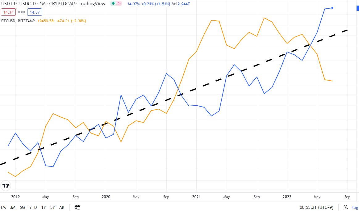 아래 차트는 비트코인 가격(노란색)과 USDT + USDC 도미넌스(파란색)를 나타낸 로그차트입니다.