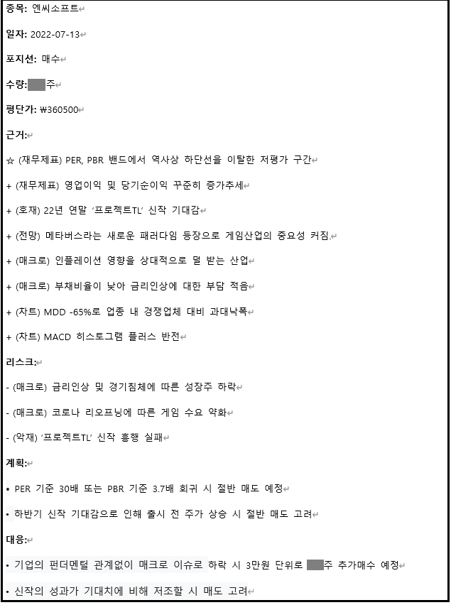 아래는 최근 제가 매수한 엔씨소프트의 실제 투자일지입니다.