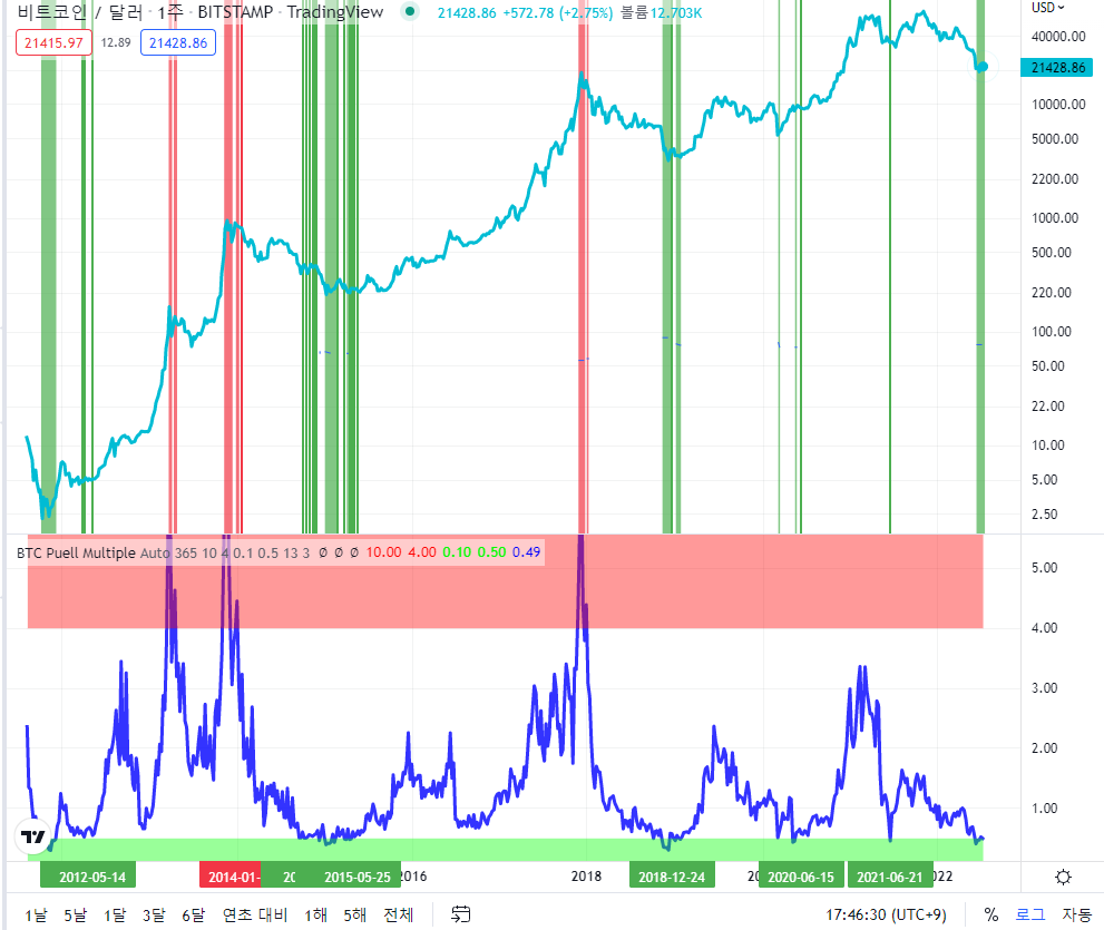 트레이딩뷰에서도 지표에 Bitcoin Fundamentals - Puell Multiple로 검색하면 그릴실 수 있습니다.