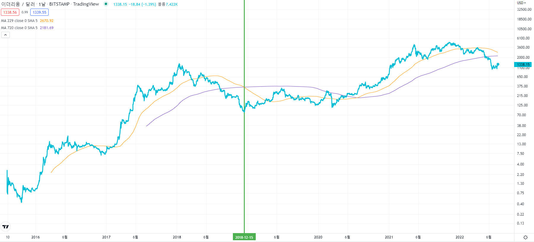 아마 아무도 이더리움 고점에 사후적으로 딱 맞는 이평선 2개 찾는 데 실패했나 봅니다.