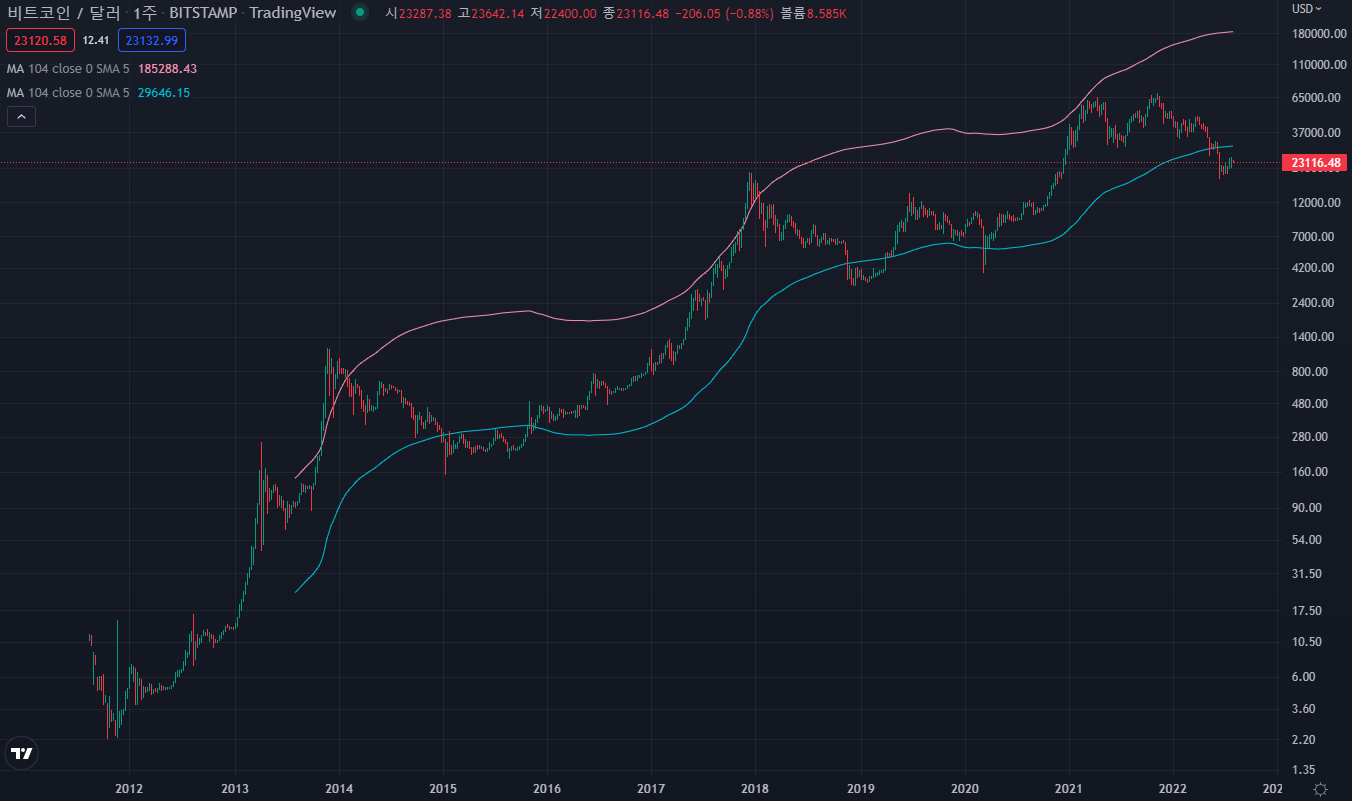 추가로, 파이싸이클은 아니지만 비트코인의 역사적 고점/저점을 나타냈던 이동평균선도 소개해보겠습니다.