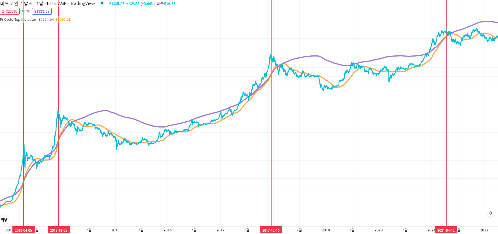 트레이딩뷰 지표에 Pi Cycle Bitcoin top indicator를 검색하면 그릴 수 있습니다.