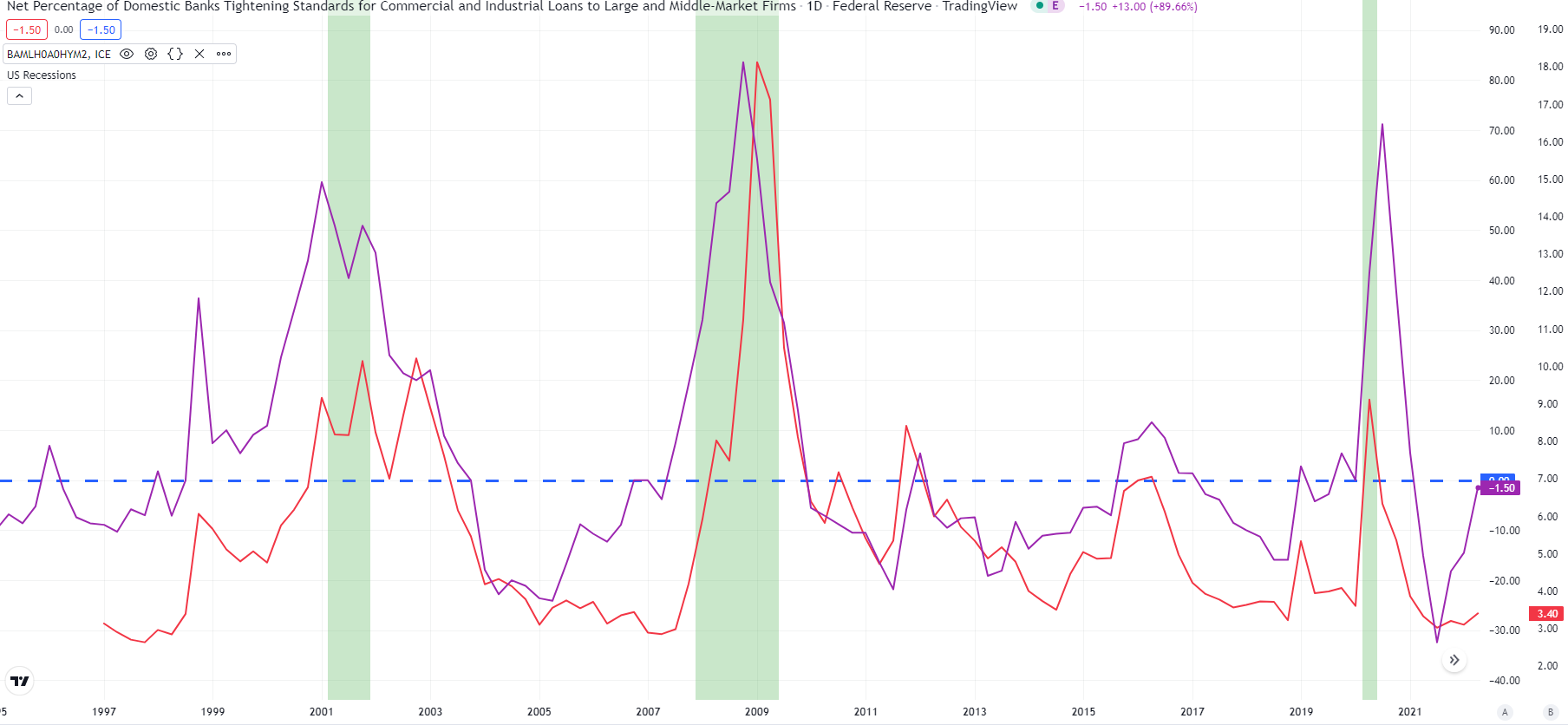 위에서 말했듯 대출기준 강화 순응답비율은 경기에 대한 전망이 크게 영향을 미칩니다.