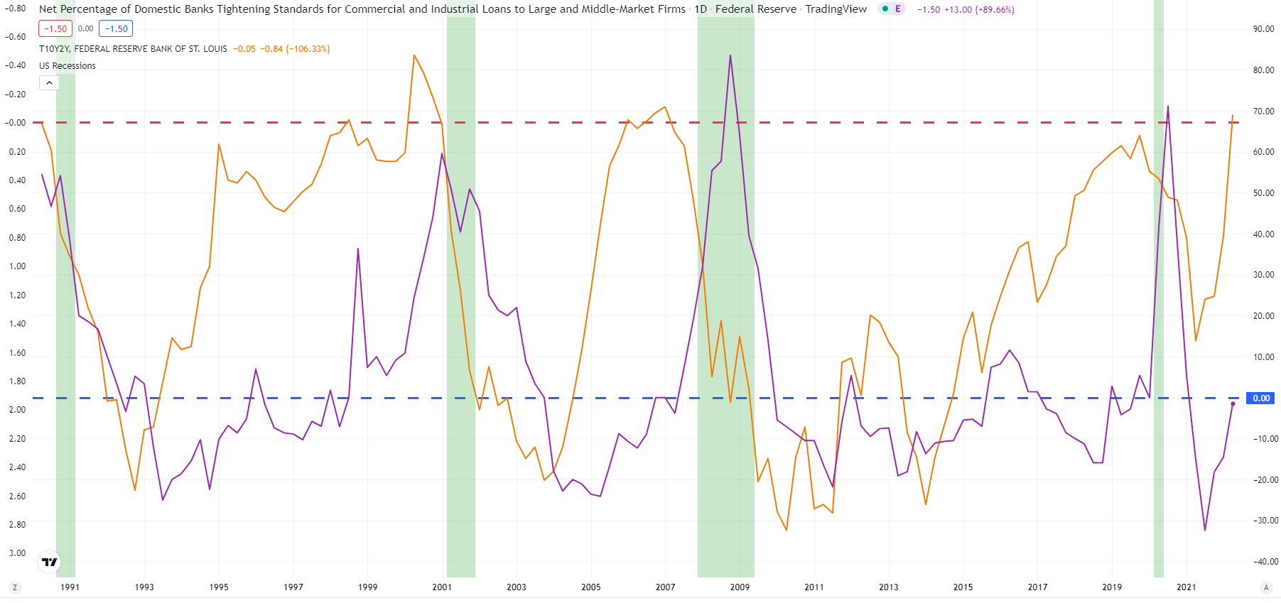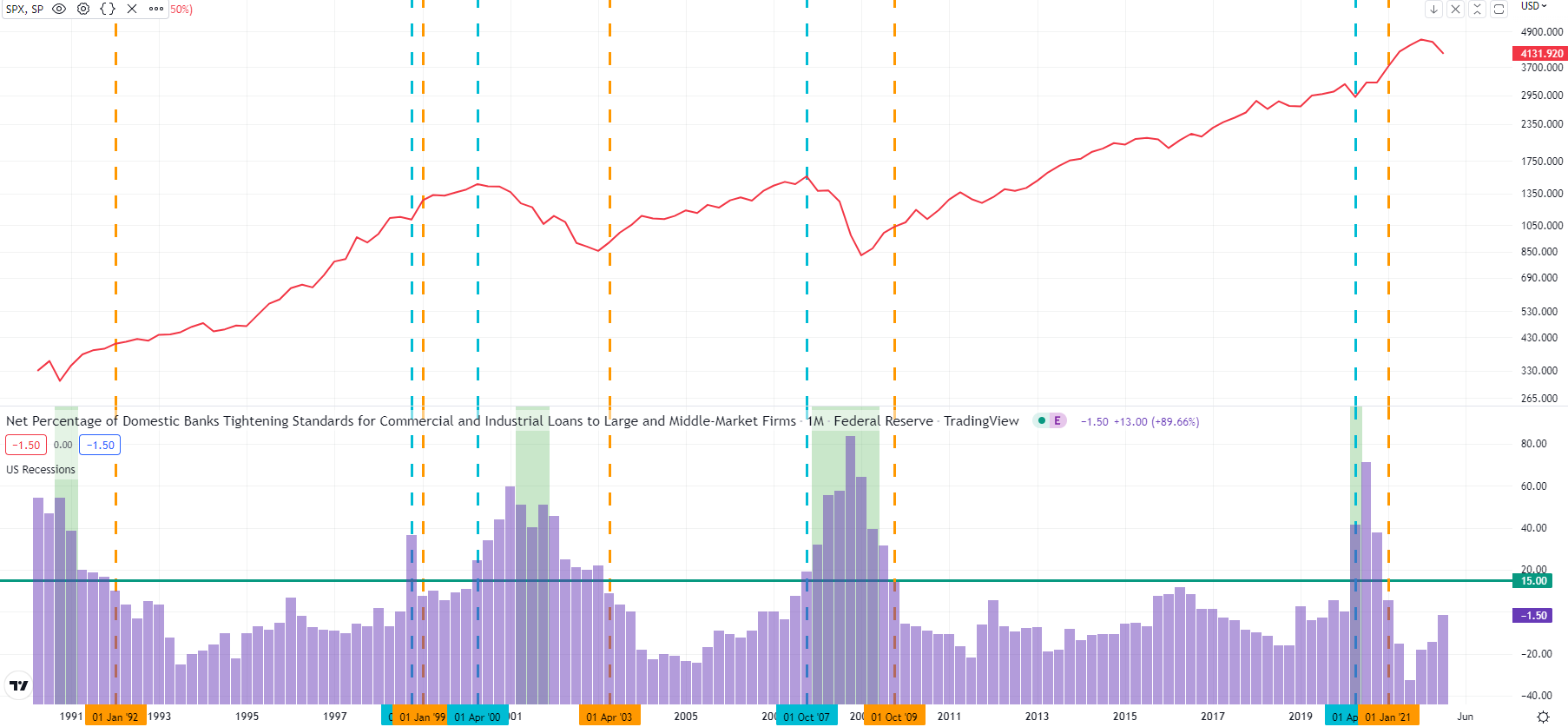 아래 그래프에서 빨간색은 S&P500지수 로그차트이며, 보라색 막대그래프는 분기별 대출기준 강화 순응답비율입니다.