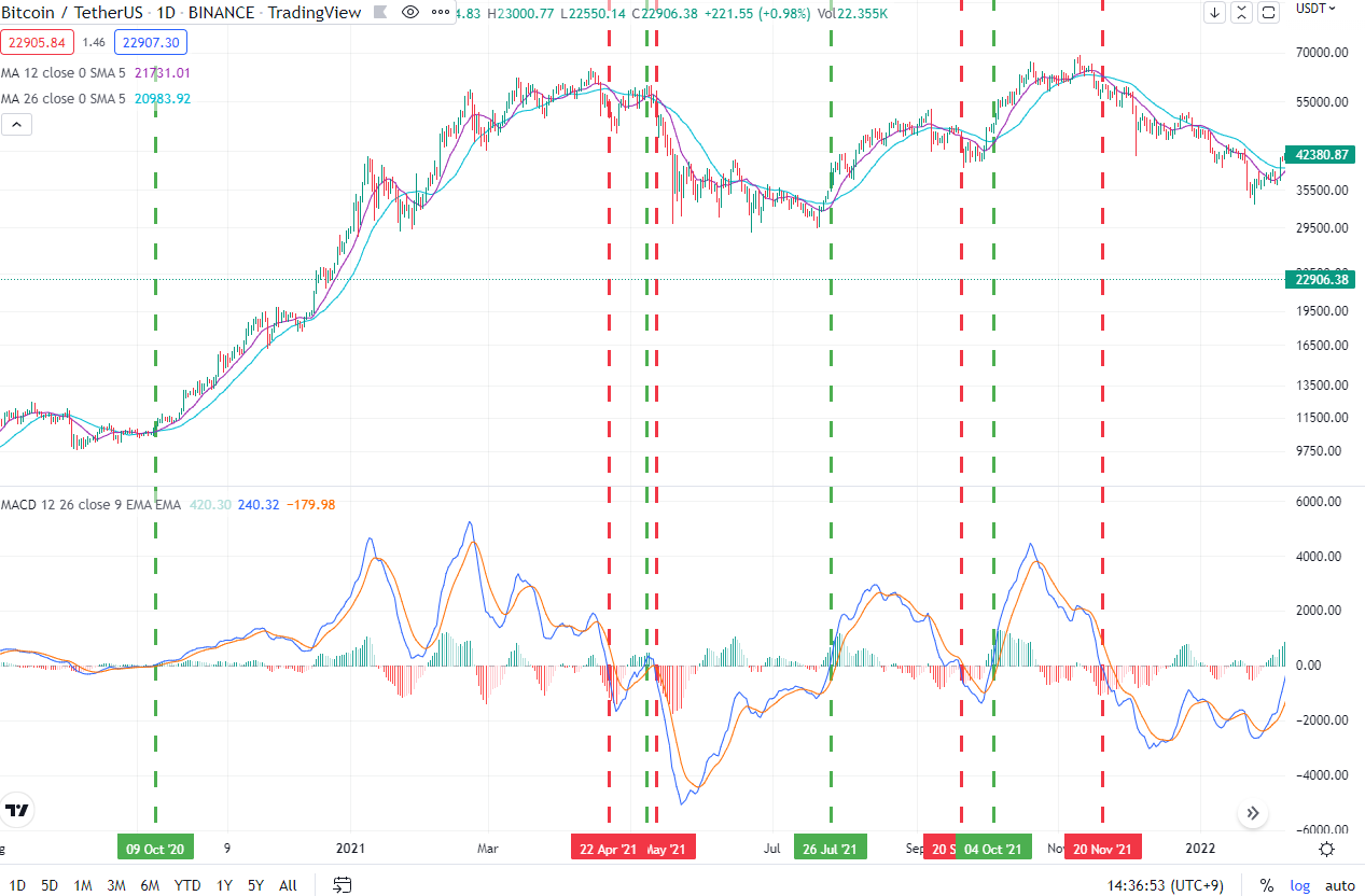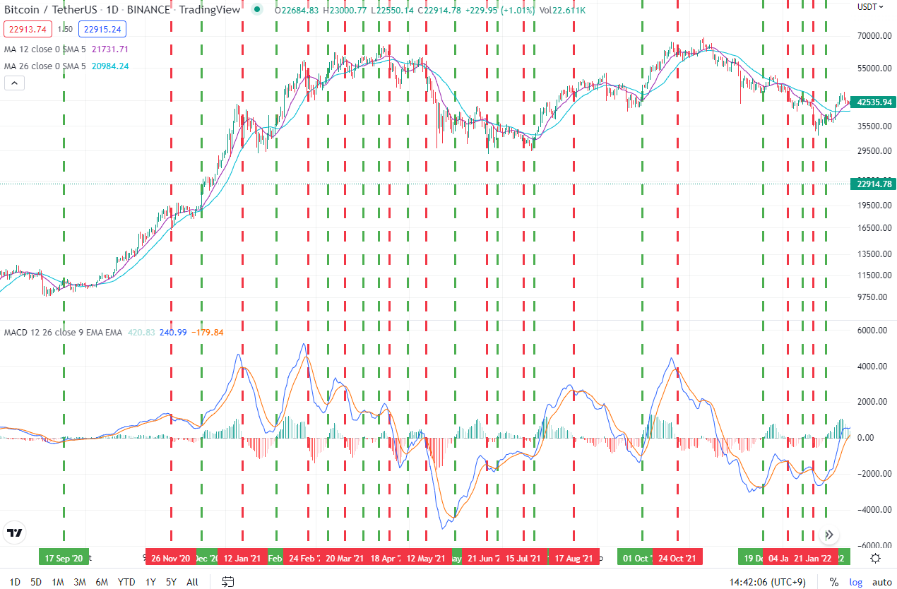 위 그래프는 비트코인 일봉에서 MACD 기준선 돌파 전략으로 매매했을 경우 타점입니다.