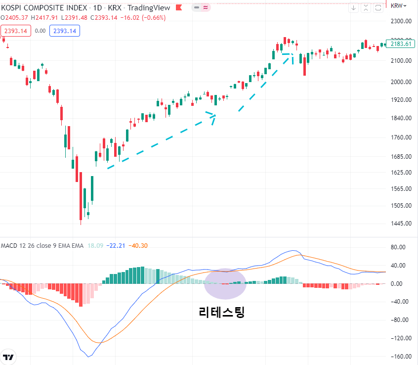 - 히스토그램이 +에서 기준선 가까이 내려간 후 0 근처에서 머물다 다시 올라가면(양의 리테스팅)