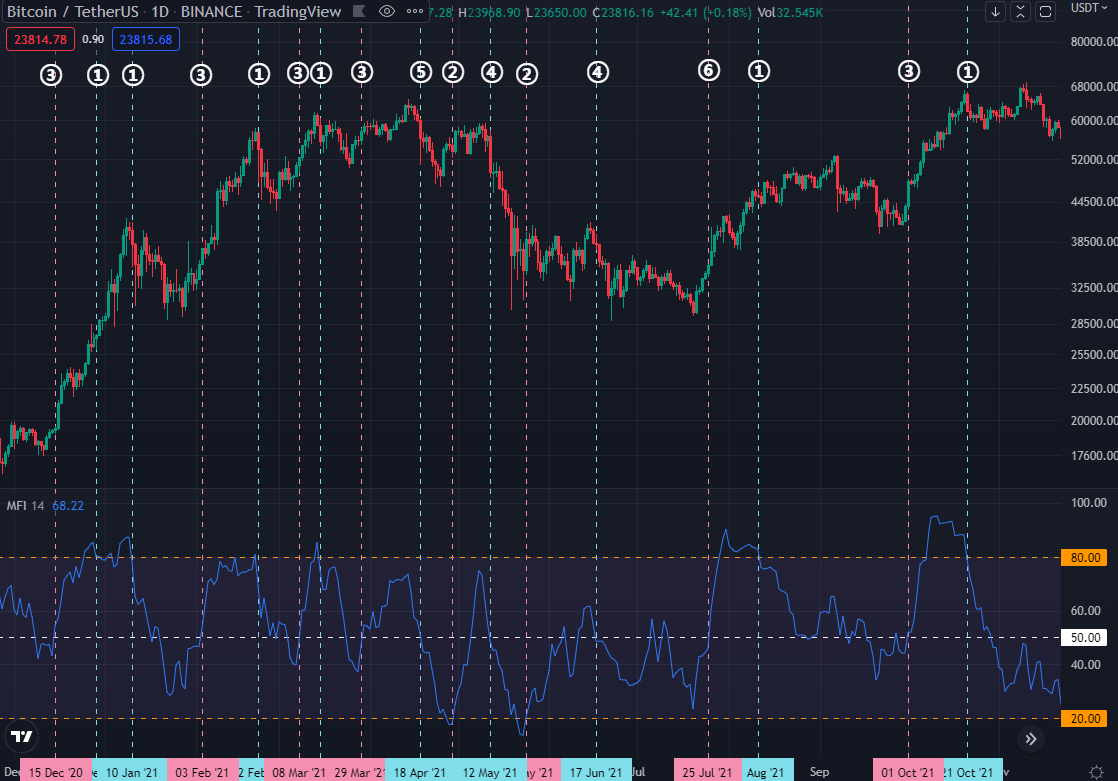 - 즉, MFI가 높다는 것은 매수세가 우세, 낮다는 것은 매도세가 우세했음을 의미합니다.