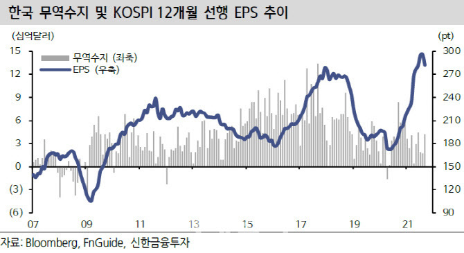 아래의 한국 무역수지와 코스피 선행 EPS 간에 상관관계를 보면,