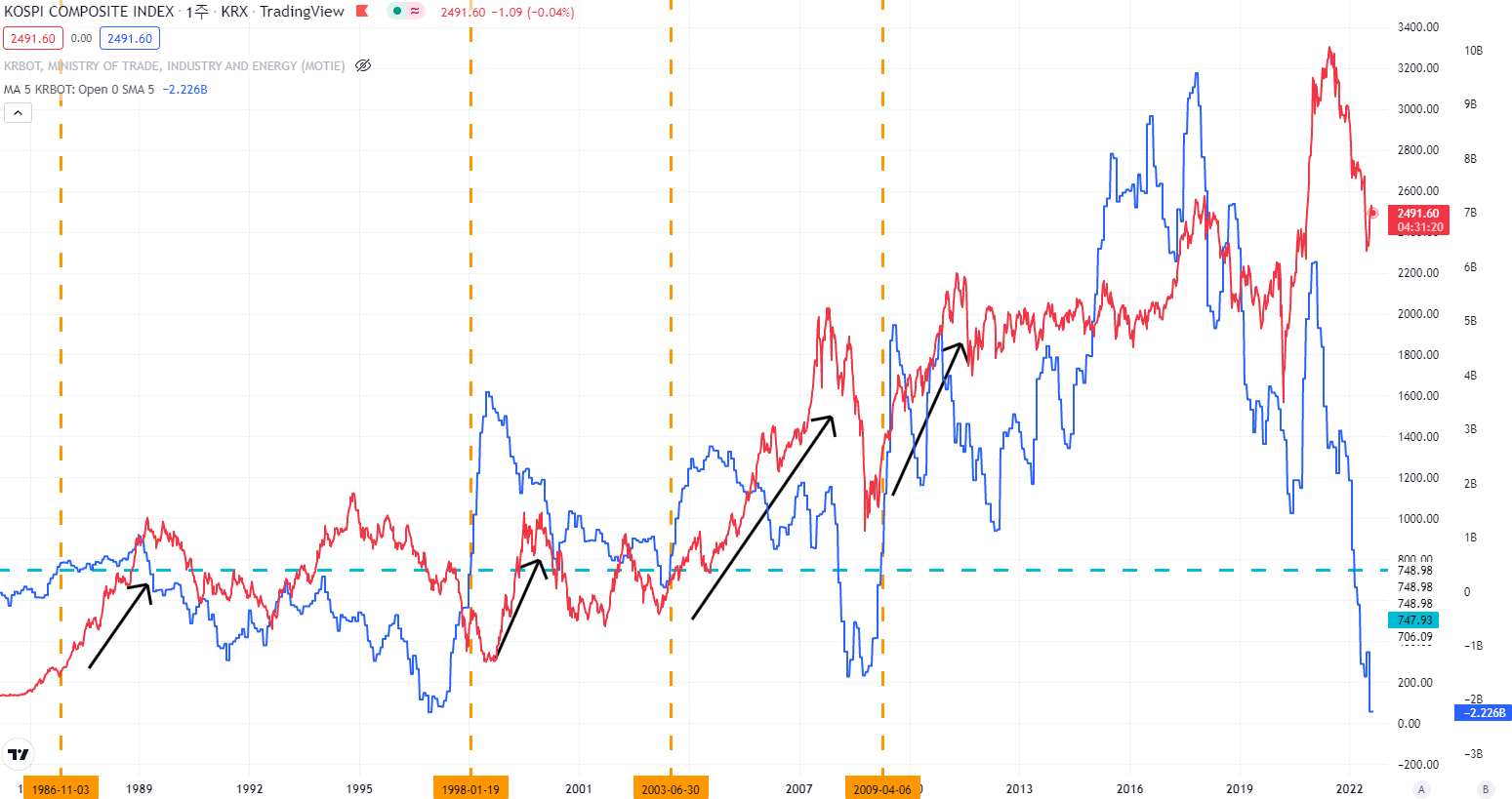 그 밑에 그래프는 코스피 지수(빨간색)와 한국 무역수지 5주 이동평균선(파란색)을 나타낸 차트입니다.