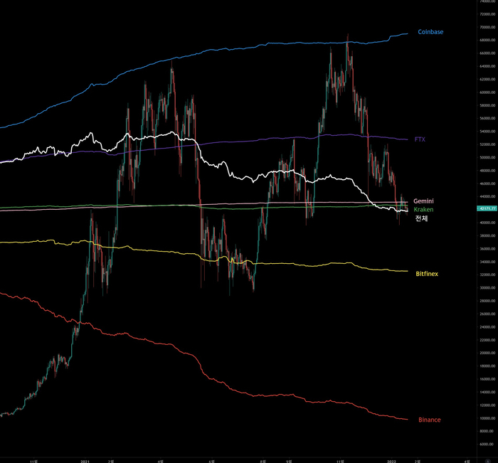 아래의 그래프를 보면 작년 상승장 동안 코인베이스와 FTX에서 지속적으로 사고