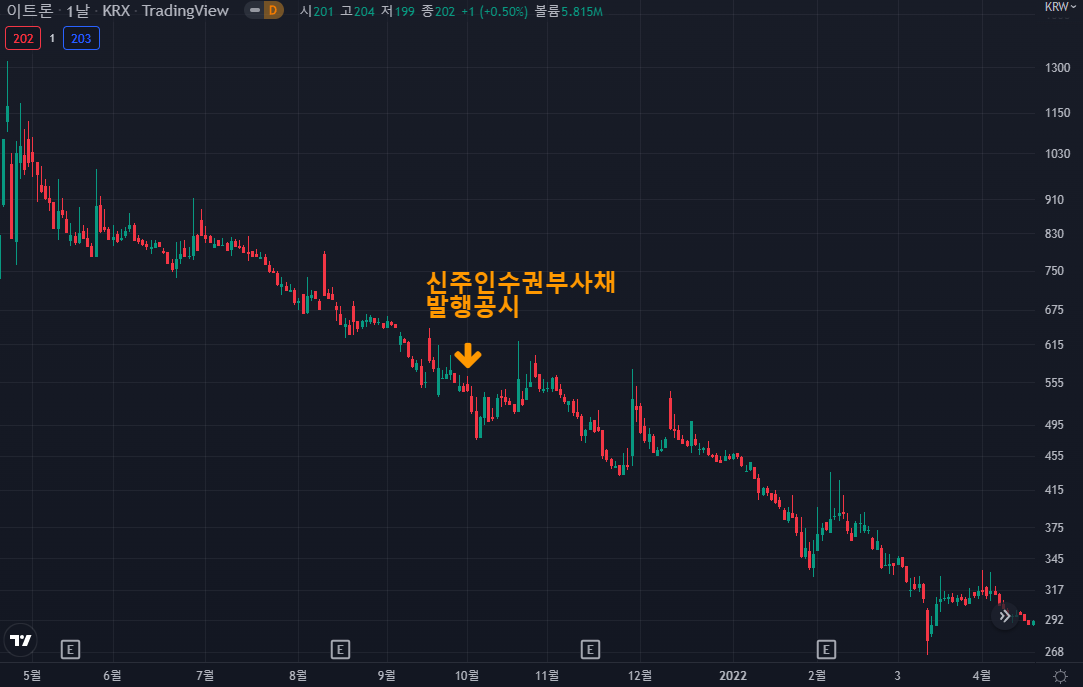 아래에 작년 10/1일 신주인수권부사채 발행공시를 했던 이트론의 주가차트에서도